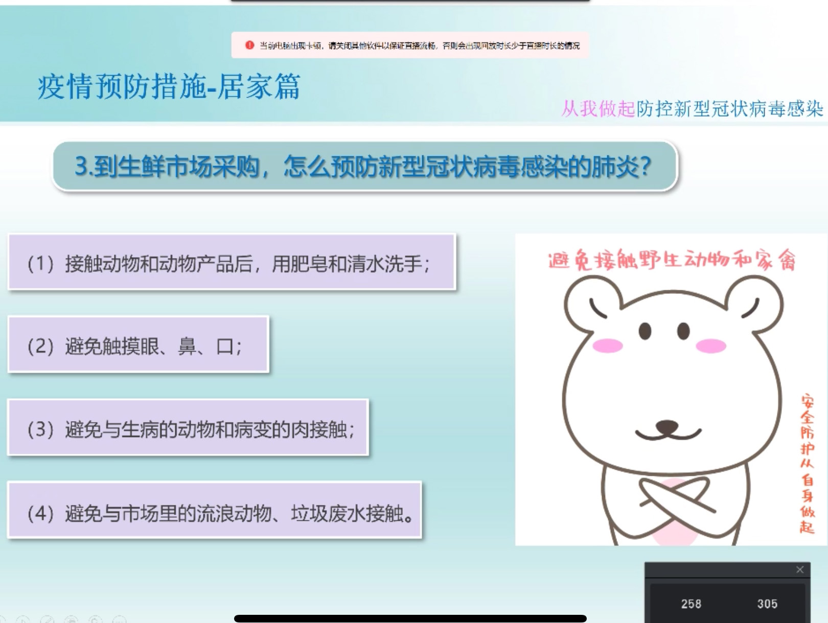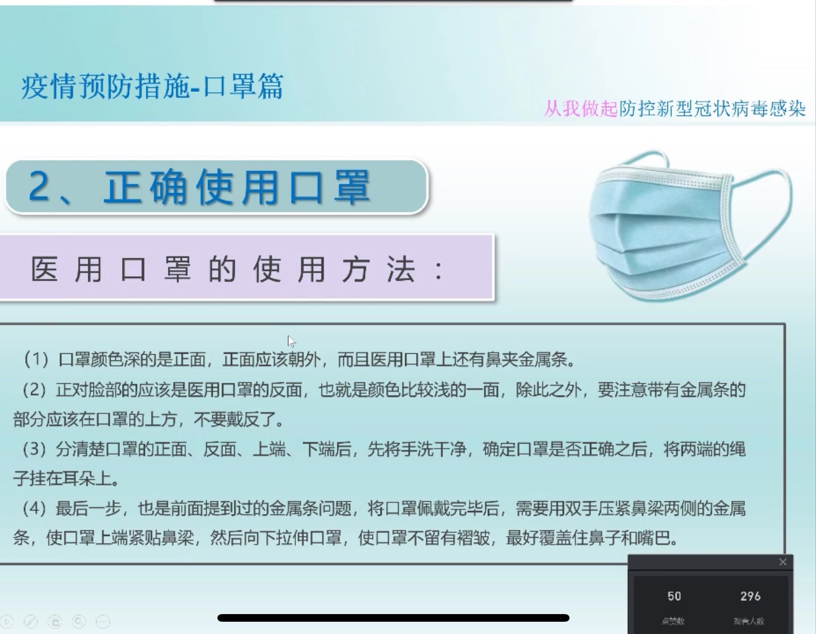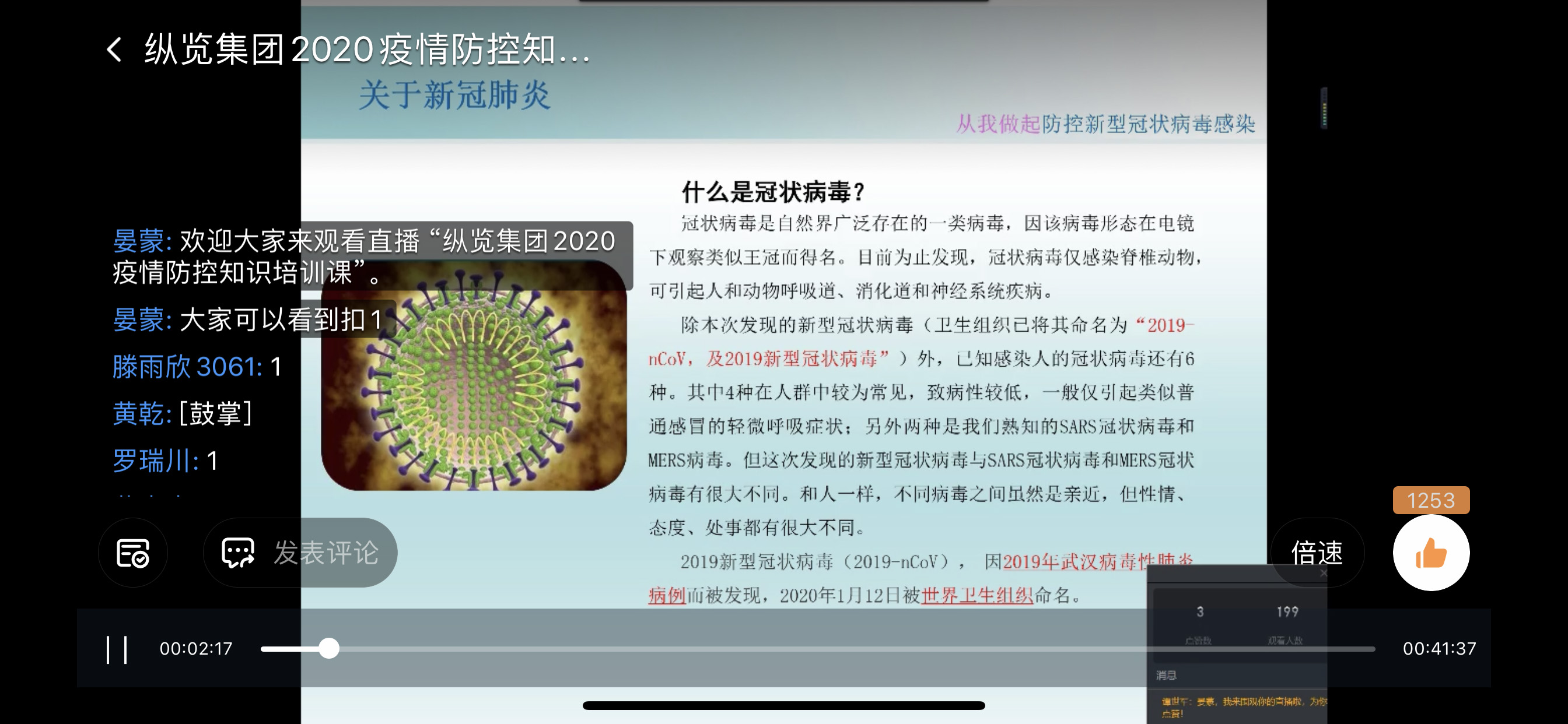 2月17日20點20分,廣西縱覽線纜集團(tuán)人力行政中心工作人員晏蒙以釘釘直播的形式,向全體員工進(jìn)行了一次新冠肺炎防控知識培訓(xùn),幫助大家正確認(rèn)識新型冠狀病毒,掌握科學(xué)防護(hù)方法。 “為了讓大家科學(xué)正確地了解防控知識,今天我們以一種不一樣的模式開啟這堂培訓(xùn)課……”在此次視頻直播里,主播的語言生動有趣又嚴(yán)謹(jǐn)科學(xué),同事們聽得津津有味。 本次直播分三個部分:一是關(guān)于新冠肺炎的相關(guān)知識,二是疫情最新動態(tài),三是疫情預(yù)防措施。 “效果非常好,語言清晰很流利!”低壓電纜事業(yè)部田利國觀看直播后說道。 直播結(jié)束后,300多位員工在線完成并通過了本次新型冠狀病毒防治閉卷考試。 |