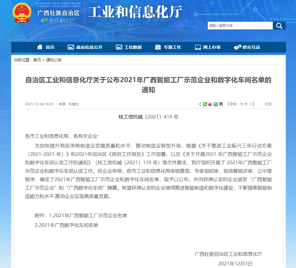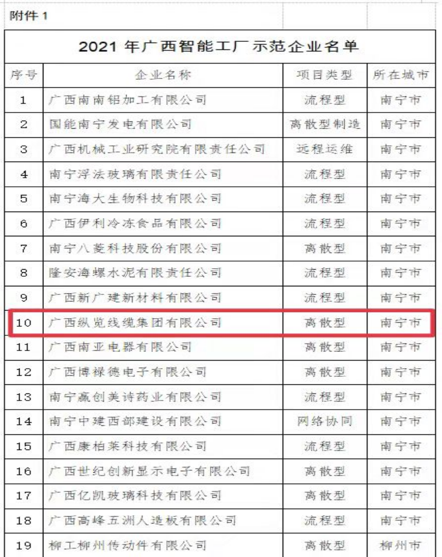 12月3日,自治區(qū)工業(yè)和信息化廳發(fā)布了關(guān)于公布2021年廣西智能工廠示范企業(yè)和數(shù)字化車間名單的通知,我集團成功入選2021年廣西智能工廠示范企業(yè)名單,獲得“廣西智能工廠示范企業(yè)”榮譽稱號。標志著縱覽線纜集團生產(chǎn)制造、產(chǎn)品質(zhì)量把控能力和水平邁上一個新的臺階,市場競爭力進一步增強。