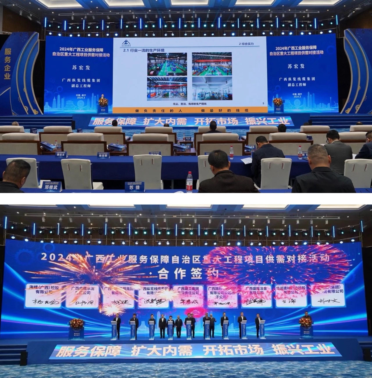 ? 3月4日,由自治區(qū)工信廳、交通運輸廳、水利廳聯(lián)合主辦,住建廳協(xié)辦的廣西工業(yè)服務保障自治區(qū)重大工程項目供需對接大會在南寧國際會展中心隆重舉行。會上,縱覽線纜集團作企業(yè)經(jīng)營發(fā)展情況匯報,并成為廣西線纜行業(yè)唯一成功簽約重大業(yè)務合作的線纜企業(yè)。 會上,自治區(qū)工信廳廳長王永超,交通運輸廳廳長劉可、水利廳副廳長黃學超先后致辭。自治區(qū)交通運輸廳、水利廳、各設區(qū)市政府領導出席會議,各市工信部門負責人、全區(qū)汽車、機械、鋼鐵(建材)、水泥、有色金屬等行業(yè)重點企業(yè),中直、區(qū)直重點企業(yè)代表共計300多人參加了本次活動。集團總經(jīng)理陳思行、董事長助理吳培軍、陳楊、張彩菊及市場部負責人、業(yè)務骨干參加會議,集團副總工程師蘇宏發(fā)代表公司作企業(yè)匯報。 一直以來,縱覽線纜集團始終堅持“做負責任的人,做最好的線纜”的愿景,在實際工作中踐行“做好產(chǎn)品回報客戶、做好企業(yè)回報社會就是黨和國家最大的忠誠”的理念。集團所取得的成績得到了國家有關部委、自治區(qū)各級政府,工信廳,住建廳、市場監(jiān)管局等職能部門的認可,成為廣西線纜行業(yè)唯一榮獲國家工信部“全國工業(yè)品牌培育示范企業(yè)”,“自治區(qū)主席質(zhì)量獎”、“南寧市市長質(zhì)量獎”等榮譽的企業(yè)??v覽線纜集團在自治區(qū)產(chǎn)業(yè)振興三年行動的引領下,榮獲了“國家級綠色工廠”、“國家知識產(chǎn)權優(yōu)勢企業(yè)”、“廣西智能工廠示范企業(yè)”、“廣西工業(yè)龍頭企業(yè)”、“廣西工業(yè)企業(yè)質(zhì)量管理標桿”等榮譽。縱覽線纜集團已發(fā)展成為代表廣西、走出廣西,服務高端市場、高端客戶的行業(yè)知名品牌,將繼續(xù)堅持守正創(chuàng)新,為服務廣西社會經(jīng)濟高質(zhì)量發(fā)展貢獻新的更大力量。 |