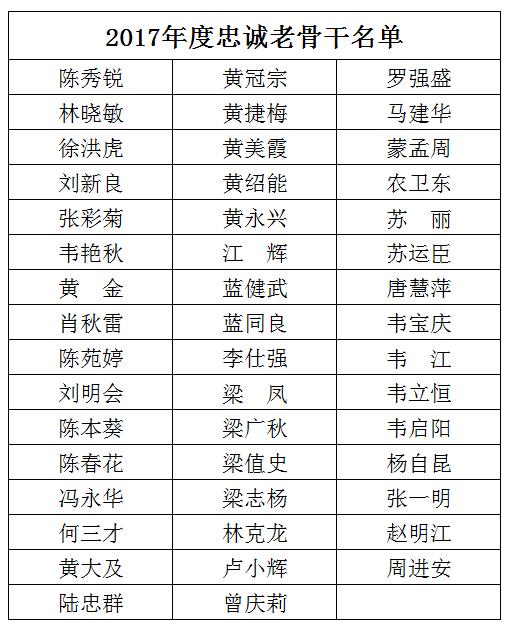 你們是堅韌不摧的榜樣力量,你們是縱覽發(fā)展史上的勞模功勛!你們時刻心系縱覽的憂患,與縱覽同風(fēng)雨、共命運(yùn),用不懈的努力為縱覽創(chuàng)造著每一筆財富,正是因為你們的付出,縱覽的今天才能夠如此絢麗,感謝你們,為縱覽這個大家庭添磚加瓦!你們的名字將永遠(yuǎn)銘刻在縱覽的功勞薄上! 讓我們一睹縱覽線纜集團(tuán)2017年度忠誠骨干老員工的風(fēng)采! 陳秀銳 林曉敏 徐洪虎 劉新良 張彩菊 韋艷秋 黃金 肖秋雷 劉明會 黃捷梅 陳苑婷 曾慶莉 陳本葵 陳春花 馮永華 何三才 黃大及 黃冠宗 黃美霞 黃紹能 黃永興 江輝 藍(lán)建武 藍(lán)同良 李仕強(qiáng) 梁鳳 梁廣秋 梁值史 梁志楊 林克龍 盧小輝 陸忠群 羅強(qiáng)盛 馬建華 蒙孟周 農(nóng)衛(wèi)東 蘇麗 蘇運(yùn)臣 唐慧萍 韋寶慶 韋江 韋立恒 韋啟陽 楊自昆 張一明 趙明江 周進(jìn)安 |